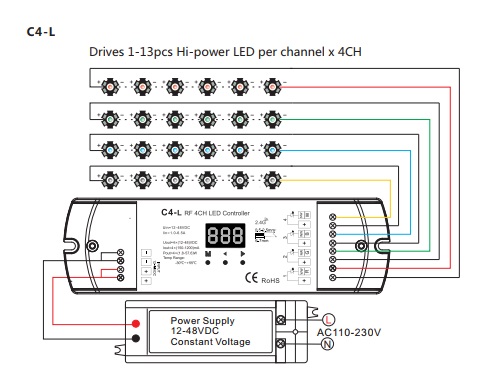 The LED controller V4-L / C4-L is a constant voltage or constant current RF receiver with numeric digital display, 4 channel output, which can be compatible with a variety of RF remotes to switch and dim RGBW, RGB, dual color or single color LEDs. Smooth dimming from 0.1% to 100% without any flickering can be very comfortable for human‘s eyes. Built-in 10 dynamic mode can create fancy lighting effects.