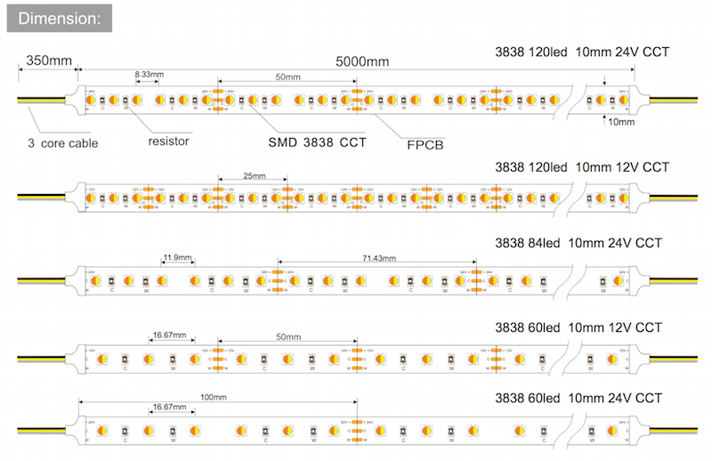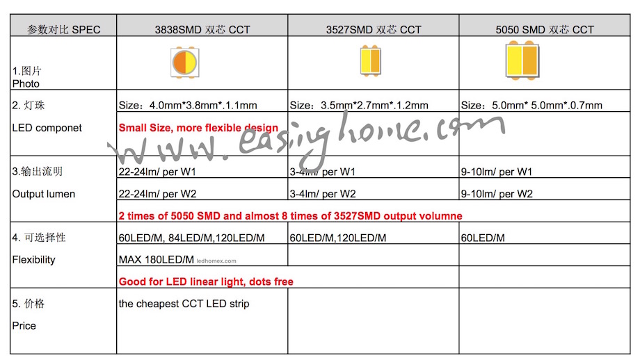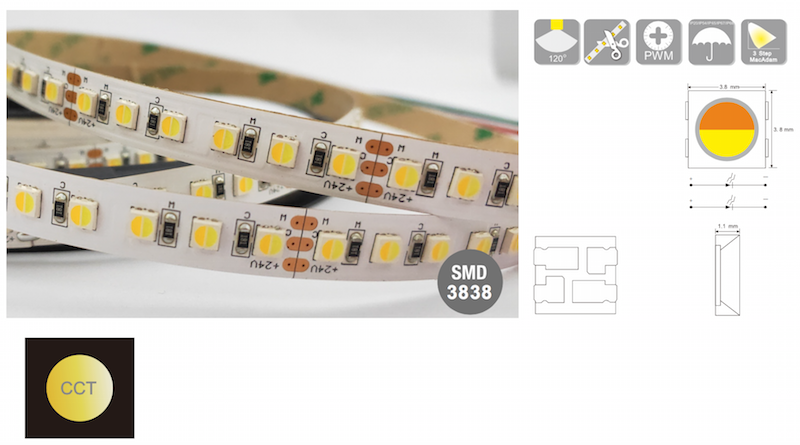 3838SMD CCT LED Component,which is dual chips in one LED, is innovated by LEDHOME to replace 5050SMD CCT LED. The purpose for LEDHOME to innovate it, firstly because 5050SMD dual color has limitation on LED layout for single row strip since 5050SMD has bigger size. And secondly customer in markets has feedback 5050SMD price is normally high cost for market requirement. Thirdly, even market has cheaper CCT LED strip but warm white and white separately, but it performs less effect for LED linear lighting to reach uniform linear light.In order to find an economic CCT strip, two color in ONE LED, but do not competitive price, LEDHOME CEO has had a great of meeting and testing with professional LED packing exporter, so finally in 2019 new year, LEDHOME has succeeded to publish this new 3838SMD CCT LED products to marketing, so that clients could find suitable CCT LED strip for LED linear lighting with good price in market. If you finding the LED specification, we could interestedly find the 3838SMD CCT LED has great high power and high output lumen, one pcs LED could reach 50lm, which is double than 1pcs 5050SMD LED.We sincerely welcome any good ideal to improve this product better for market, if you interest, pls contact us freely.